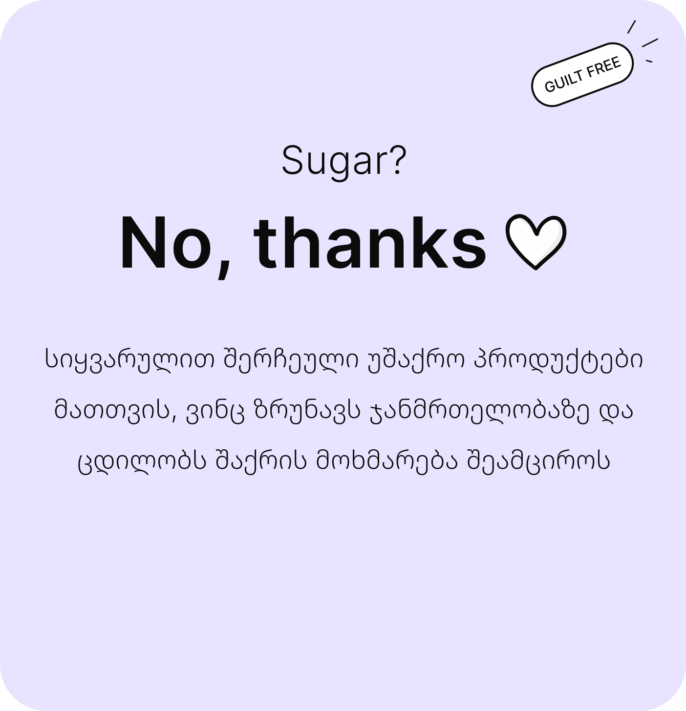 დაათვალიერე პროდუქტები დაათვალიერე პროდუქტები კატეგორიები შაქრის შემცვლელები → ჯემები → უშაქრო ტკბილეული → კატეგორიები შაქრის შემცვლელები → ჯემები → ტკბილეული → ფიქრობდი, რომ შაქრის გარეშე მოსაწყენია? დროა გადაიფიქრო ჩვენ ვარჩევთ პროდუქტებს თქვენთვის, რომლებიც ამ სტერეოტიპს დაამსხვრევს. გემო რჩება, შაქარი კი არა. მიირთვი გემრიელად დანაშაულის გრძნობის გარეშე. ჩვენ ვარჩევთ პროდუქტებს თქვენთვის, რომლებიც ამ სტერეოტიპს დაამსხვრევს. გემო რჩება, შაქარი კი არა. მიირთვი გემრიელად დანაშაულის გრძნობის გარეშე. რჩეული ბრენდები რჩეული ბრენდები
